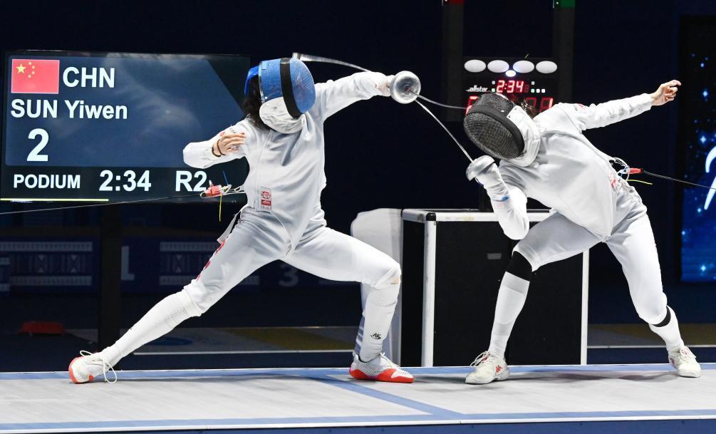 6月22日,中国选手孙一文(左)与队友余念念涵在2024年亚洲击剑锦标赛女子个人重剑比赛中。新华社发(阿萨德摄)