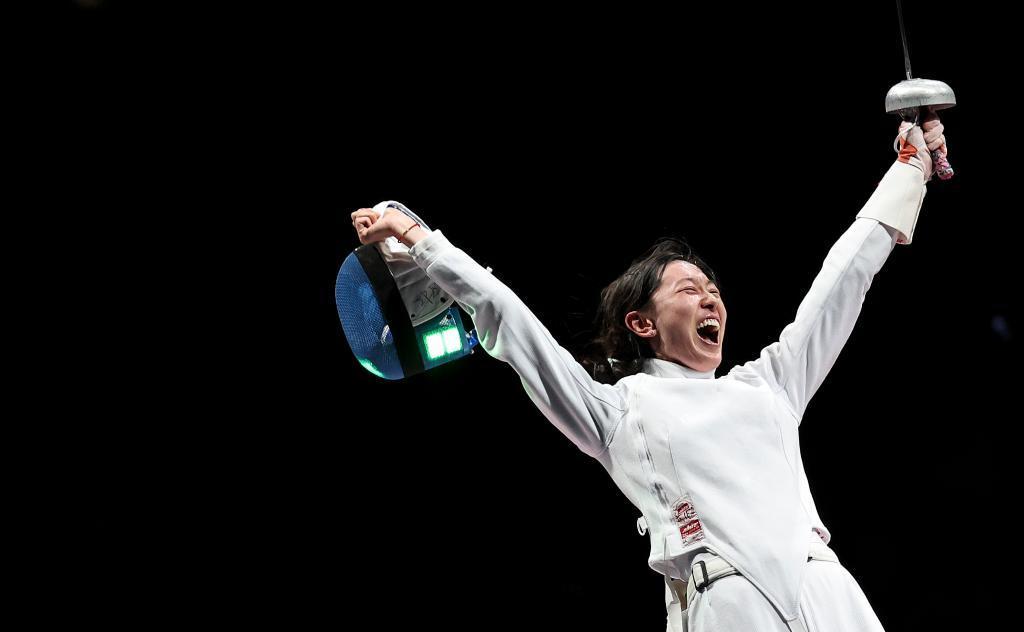 2021年7月24日,孙一文在东京奥运会击剑款式女子个人重剑决赛后庆祝。新华社记者 李明 摄