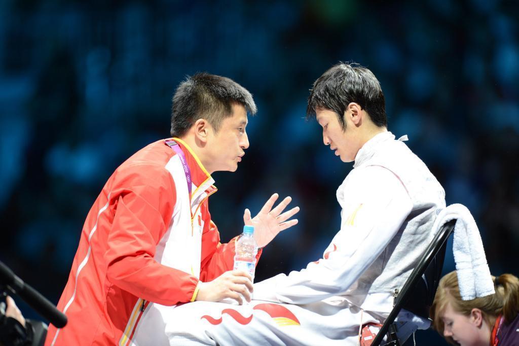 2012年7月31日,中国选手雷声(右)在比赛流毒继承考验王海滨勾通。当日,在伦敦奥运会击剑男人花剑个人决赛中,雷声夺得金牌。新华社记者 郭勇 摄